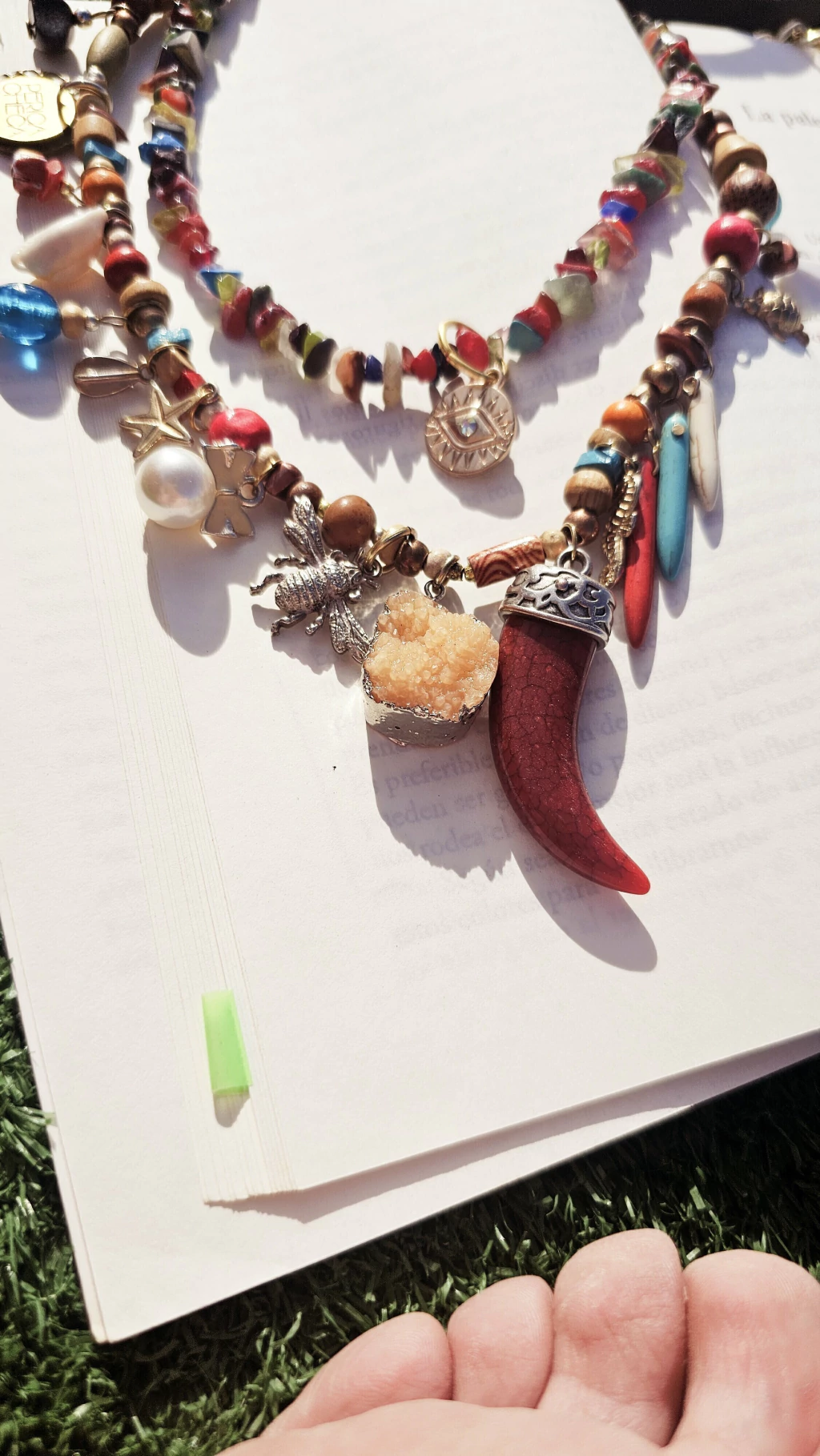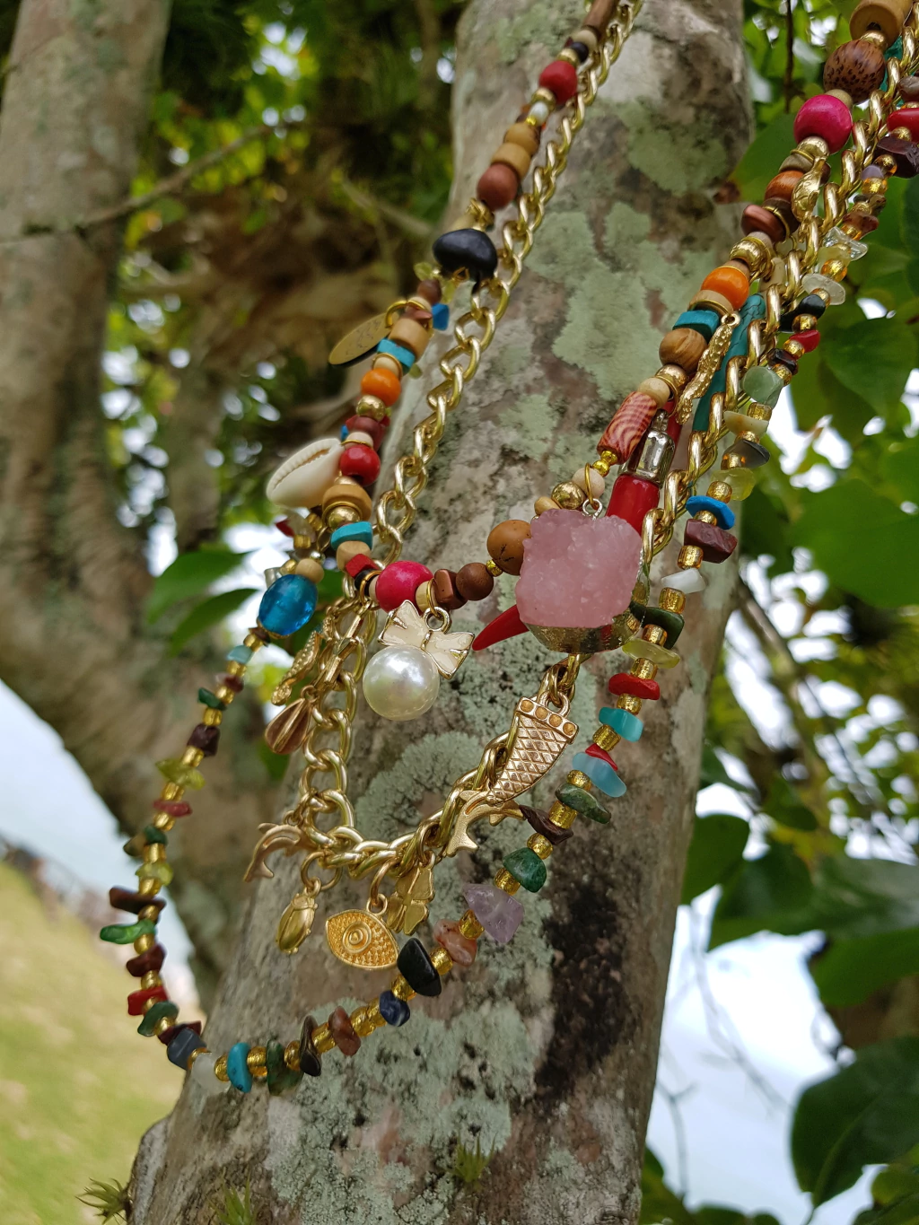 Confeccionado con cuentas varias piedras, madera y vidroo dan vida a este accesorio atemporal y estetico.