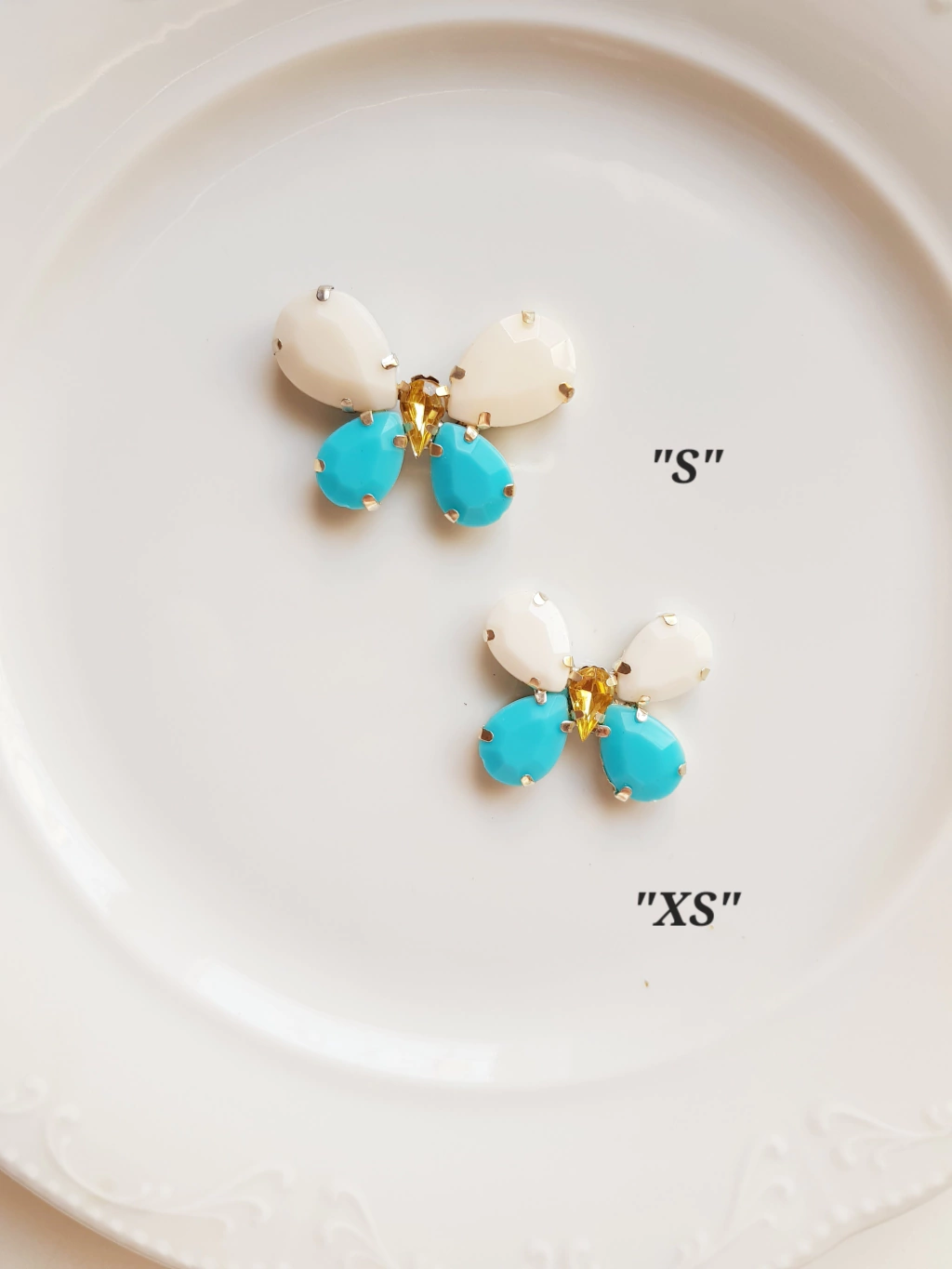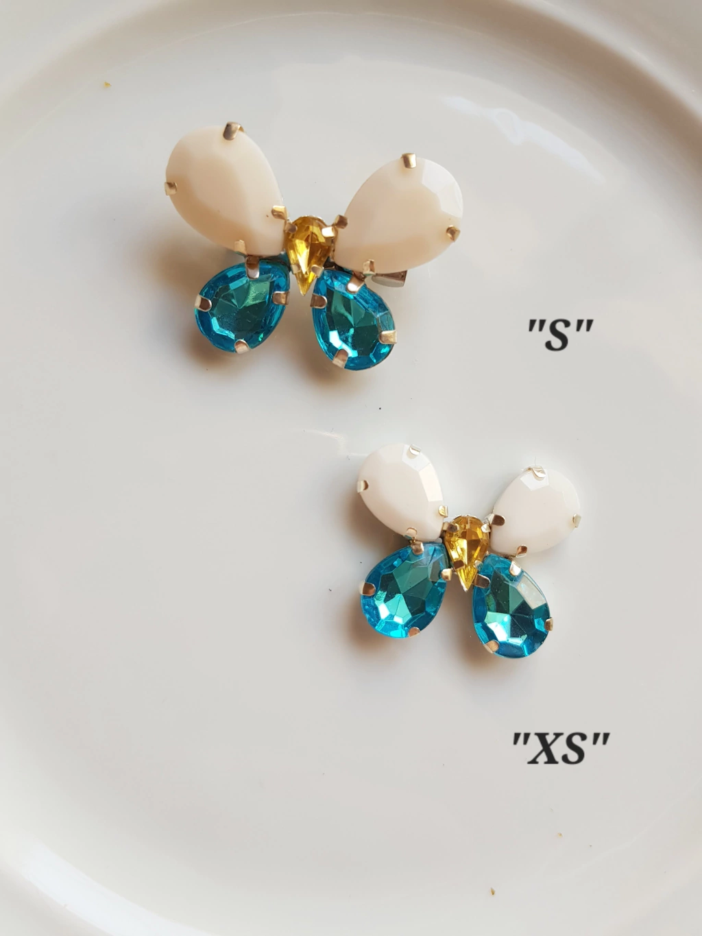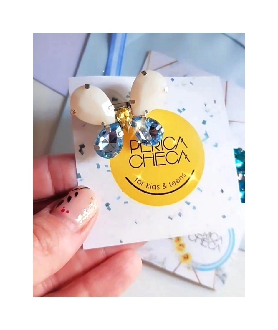 Escarapela de diseño. Gemas acrilicas color diferentes tonos celeste opaco, brilloso, turquesa, blanco, oro soldadas con estaño en forma de mariposa.
