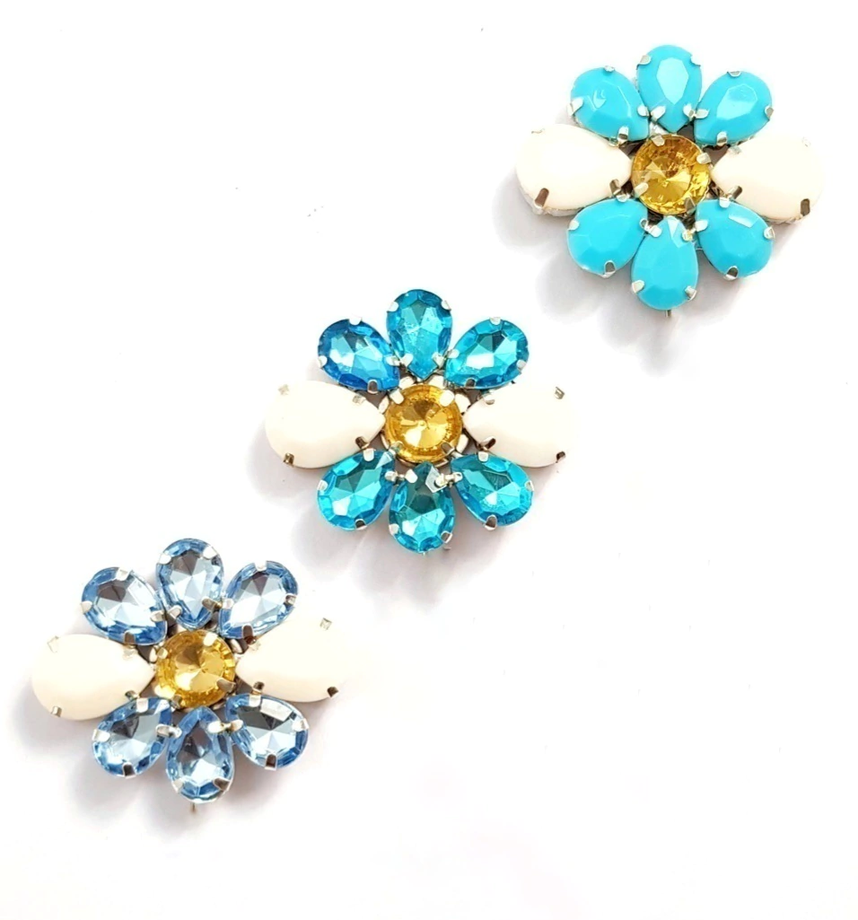 Escarapela de diseño. Gemas acrilicas color celeste opaco, celeste brilloso, turquesa, blanco y gema color oro claro soldadas con estaño.