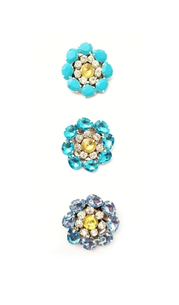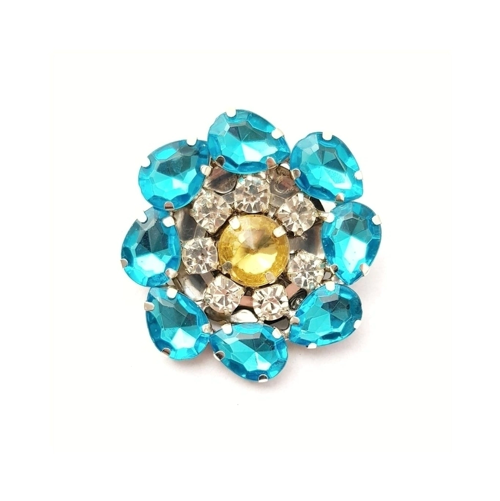 Escarapela de diseño. Gemas acrilicas color aqua, turquesa y celeste brillosa centro de strass y gema color oro soldadas con estaño.