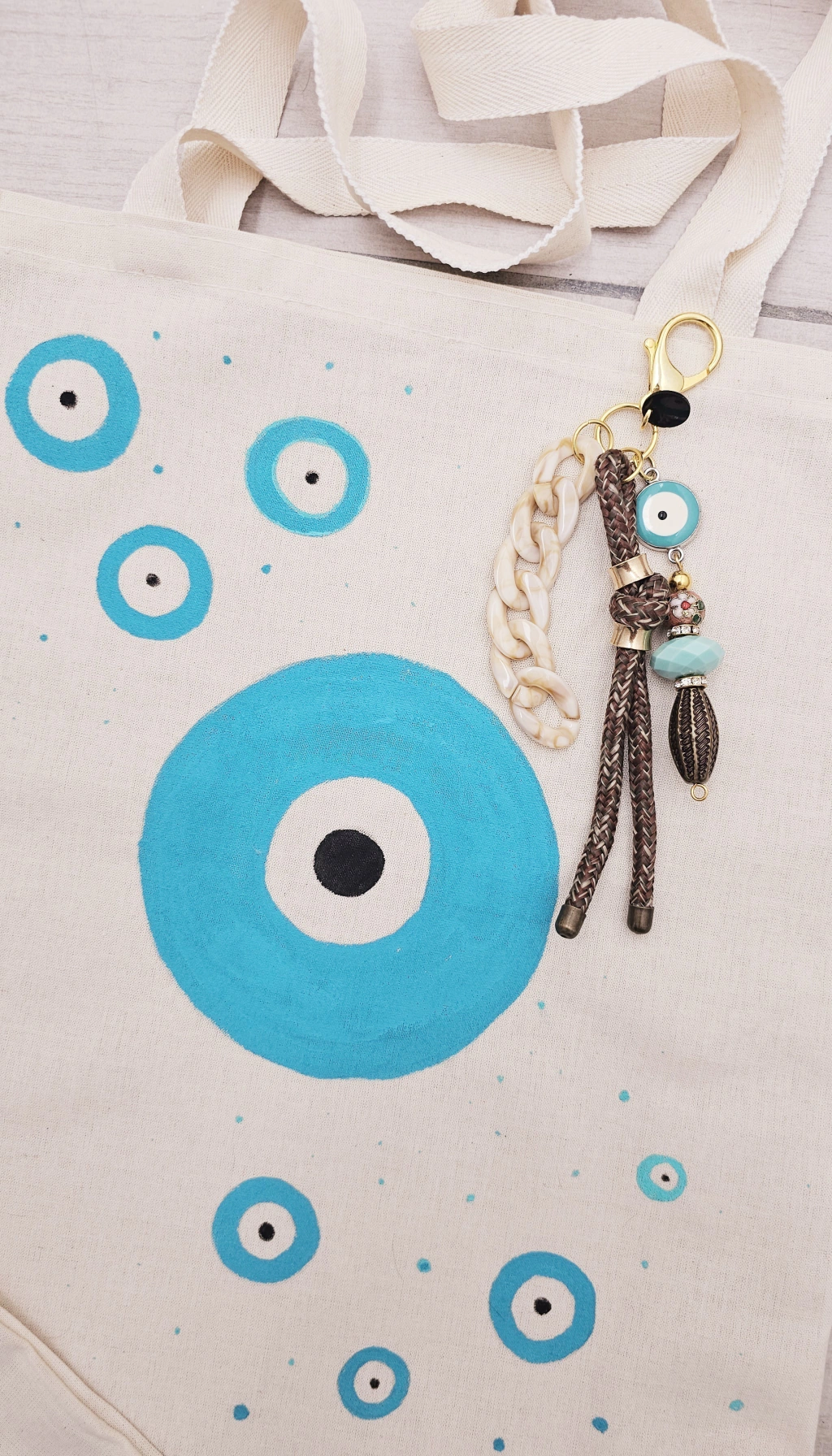 El proceso es tan único como cada pieza. Cada Set Somos Energía se compone por una Tote Bag - bolsa de lienzo - pintada a mano con dedicación, mientras que el 🧿📿✨️ LLAVERO Evil Eye ✨️📿🧿completan esta experiencia sensorial con un diseño exclusivo. 🌟 Compuesto por cristales facetados ofrecen una belleza única y una energía positiva que te acompañará a donde vayas. Cada combinación de colores está cuidadosamente seleccionada para complementar cualquier atuendo y elevar tu estilo personal.